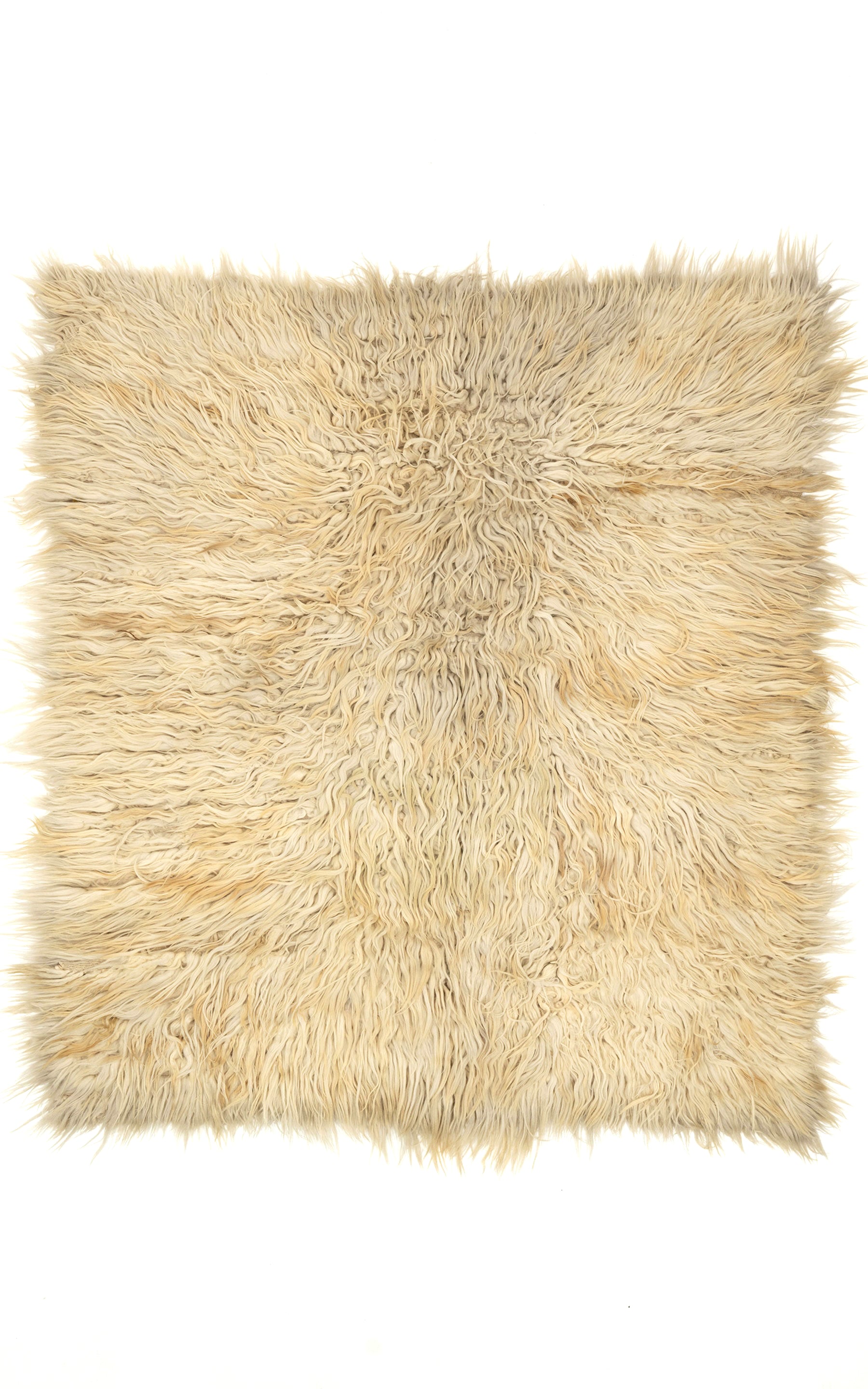 Absolutely stunning set of vintage undyed, natural coloured angora goat hair Tulu rugs handmade in Bulgaria in the 1970’s. These cream and beige-brown Tulu rugs are sumptuously dense and display a subtle yet visually appealing tonal variation inherent of the natural wool. Each lock of wool is bound by hand to the underlying flat weave and then combed and washed. This final process causes them to become extraordinarily soft and plush which is why nomadic mountain tribal peoples found them essential to keep warm in the harsh elements. In modern times they provide not only aesthetic effect but also practicality similar to their historical use. Perfect for lounging on the floor beside a fire, hung on the wall for insulation or solely artistic intent they also look glorious when used as bed covering adding a decadent texture and visual warmth. There are four pieces in this set and they offer great versatility of use. The two smaller squares would make for extravagant floor pillows or even a hanging headboard. The rectangle a phenomenal bolster and the large square a bedcover that is a bohemian dream.